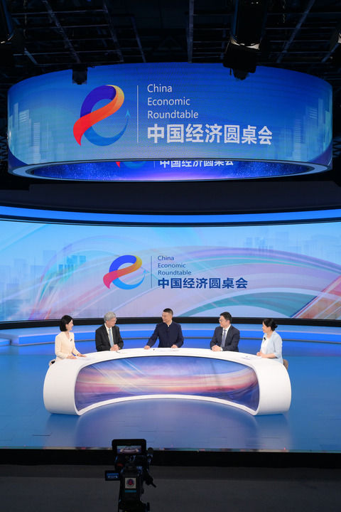嘉宾们在第十五期■★“中国经济圆桌会◆■■■■”大型全媒体访谈节目录制现场交流发言。新华社记者 李贺 摄