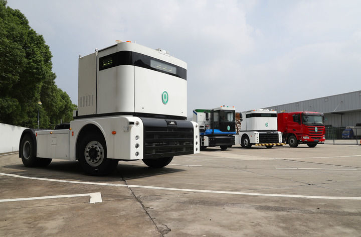 2023年9月26日,一辆西井科技的无人驾驶重卡Q-Truck(前)在位于上海的无人驾驶商用车联合实验室场地上进行动态测试★★★◆。新华社记者 方喆 摄