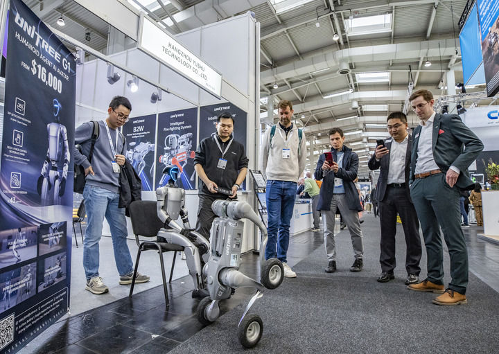 2025年4月1日,在德国汉诺威工业博览会上,人们在宇树科技展区观看机器狗演示★■■■◆。新华社记者 张帆 摄